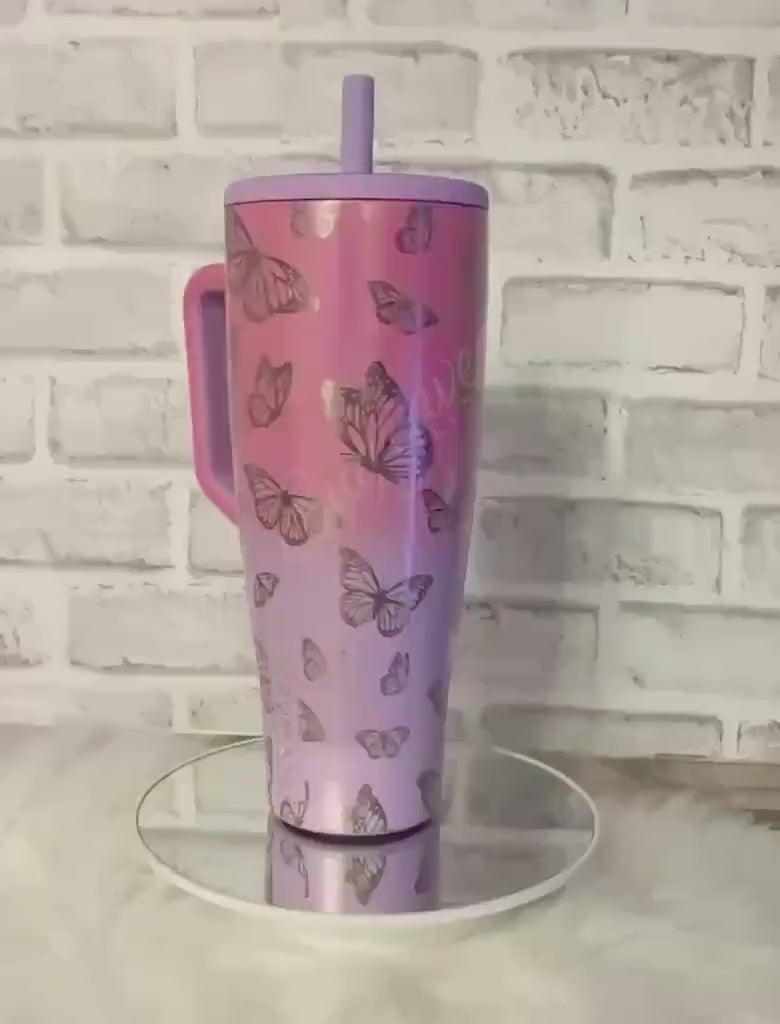The engraved Brumate tumbler is a 40 oz Brumate Era insulated stainless steel cold drink tumbler designed with a unique butterfly design cup in the limited edition cotton candy tumbler color. This stylish drink container keeps beverages cold for hours while offering leak proof drinkware performance, making it an ideal personalized engraved gift for anyone who values both function and fashion. Crafted with durable materials and precise engraving, this custom engraved cup combines beauty and practicality, backed by careful packaging and $100 insurance for safe delivery.