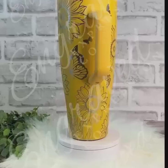 - Laser etched tumbler with detailed floral sunflower design and butterfly engraved cup