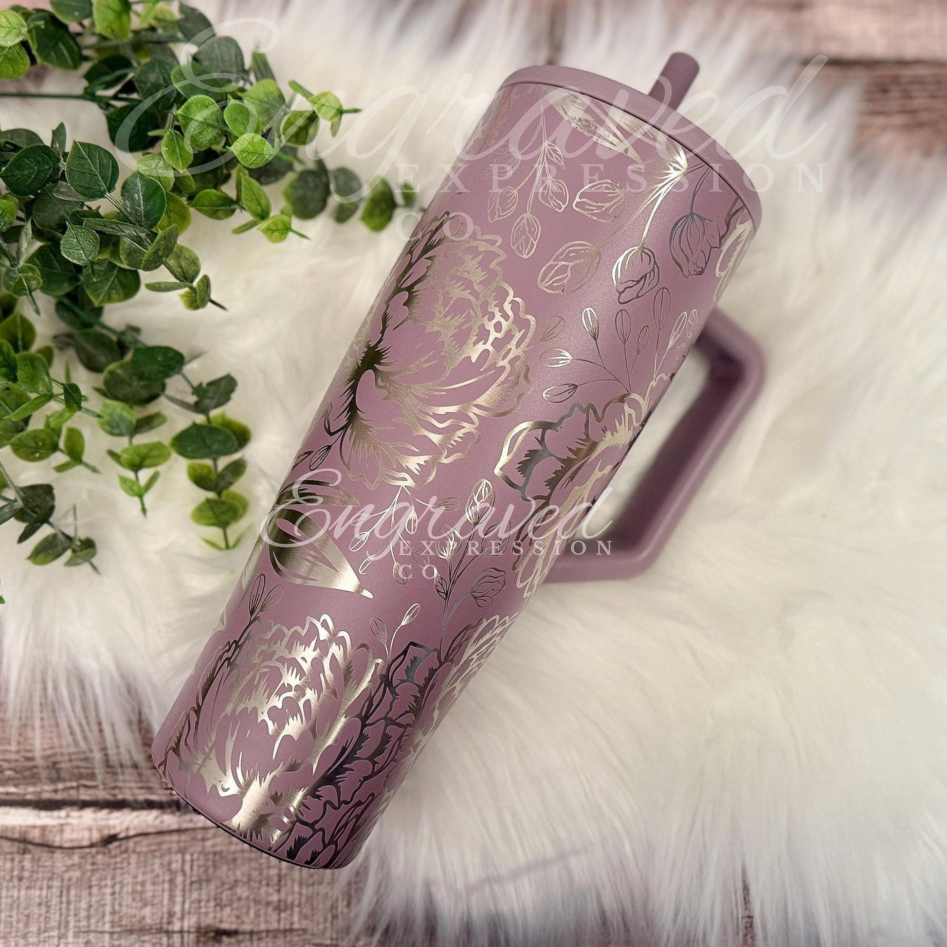 - Custom engraved tumbler with detailed peony floral engraving