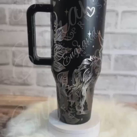 The Engraved Hydrojug Tumbler is a durable stainless steel insulated drink container designed to keep you hydrated all day with its large capacity tumbler feature. This custom engraved cup showcases a detailed Highland Cow tumbler design combined with a beautiful Sunflower HydroJug motif, making it an ideal personalized water bottle for nature lovers. Crafted for both style and function, this black travel tumbler offers full wrap engraving that adds a unique, sophisticated look while ensuring leak proof travel mug performance. With its sturdy construction and sleek finish, this engraved traveler cup is perfect for outdoor adventures, office use, or daily hydration needs.
