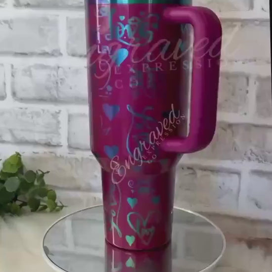 This engraved Stanley tumbler in the limited edition Berry Truffle color is a durable travel mug designed to keep drinks cold or hot for hours. Featuring vacuum insulated bottle technology, this Stanley Quencher cup maintains your beverage temperature whether you are on the go or relaxing at home. The custom engraved cup offers a personalized Stanley gift option with laser engraved drinkware that includes a custom name tumbler feature, making it an ideal engraved drinkware gift for birthdays or special occasions.