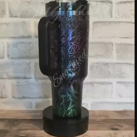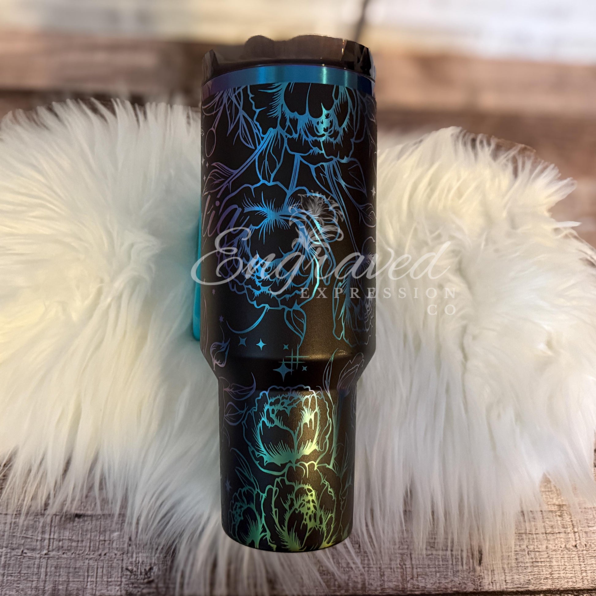 Engraved Stanley Tumbler | Black Chroma Stainless Steel Cup With Peony Flower Engraving