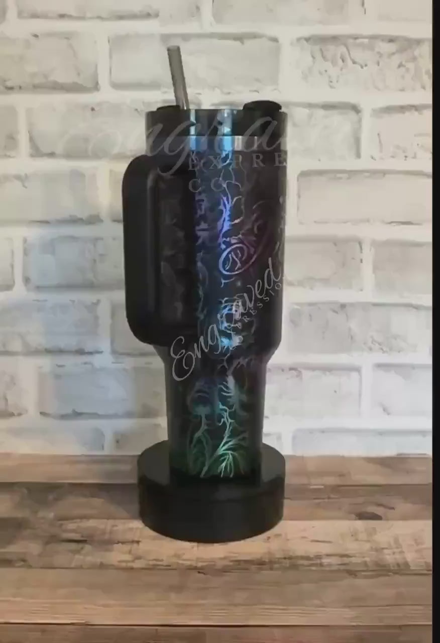 The Engraved Stanley Tumbler offers a stylish and functional way to enjoy your favorite beverages, featuring a stunning peony flower engraving that makes it a perfect personalized travel mug for any nature lover. Crafted from premium stainless steel, this Black Chroma tumbler is designed with double wall vacuum insulation to keep drinks hot or cold for hours, making it an ideal thermal drinkware companion for daily use or outdoor adventures. With a capacity of 20 ounces, this engraved drink container balances portability with ample volume for coffee, tea, or iced beverages. The precise peony flower engraving adds an elegant floral design cup aesthetic that stands out from ordinary tumblers, while the durable vacuum insulated tumbler construction ensures long-lasting performance and temperature retention.