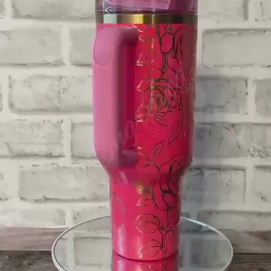 The Engraved Stanley Tumbler offers a unique blend of style and function, crafted for those who appreciate personalized drinkware with lasting quality. This Pink Parade tumbler features a custom engraved tumbler design with a delicate engraved rose pattern, making it an ideal choice for a graduation gift cup or a nature lover gift. Made from premium stainless steel, this vacuum insulated cup uses double wall insulation to keep your beverages hot or cold for hours, ensuring your drink stays at the perfect temperature throughout the day.