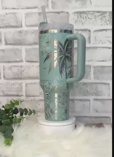 Laser Engraved Tumbler - Stanley Insulated Travel Cup With Beach Design & Floral Engraving
