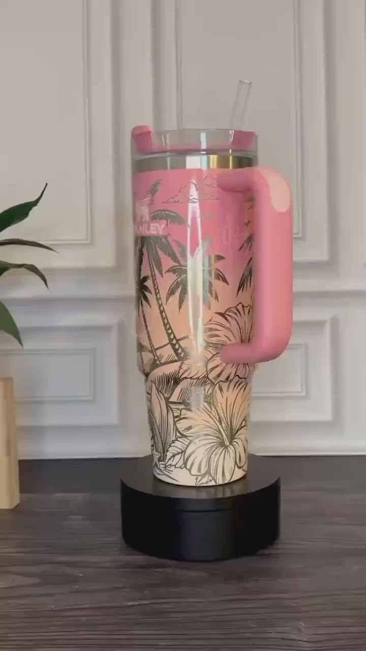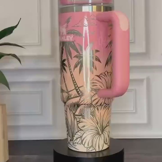 This laser engraved tumbler, the Laser Engraved Stanley Tumbler: Pink Mesa Sunset Summer Beach Design, offers a vibrant tropical design perfect for summer travel and tropical vacation tumbler needs. Crafted with insulated stainless steel, this durable drink container keeps beverages hot or cold for hours. Featuring a stunning ombre color tumbler finish in Pink Mesa Sunset, it includes a full wrap engraving of a charming beach design tumbler that radiates warmth and relaxation. Available in both 30oz and 40oz sizes from the Stanley Protour series, this Stanley Quencher cup is made to order and can be personalized, making it an ideal custom engraved cup or personalized drinkware gift.