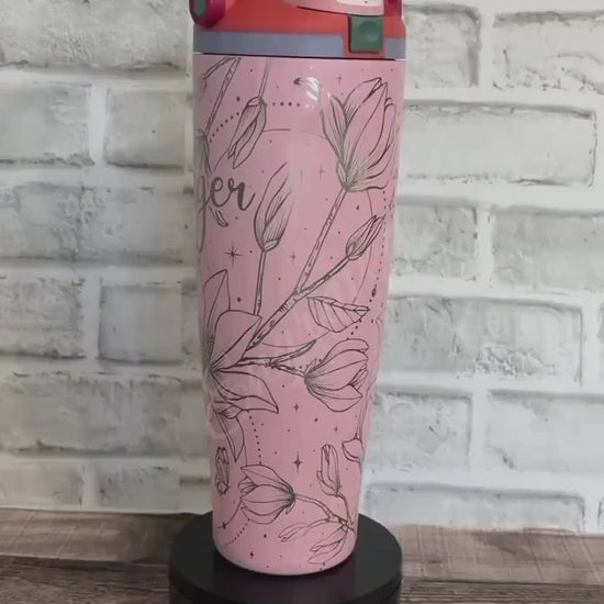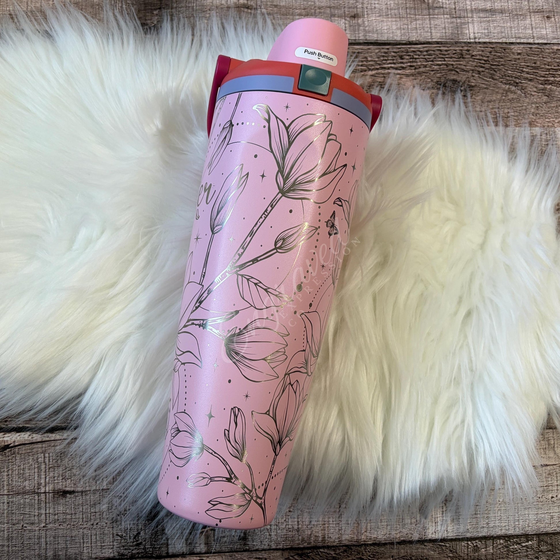 The Owala Sway Tumbler is a premium custom laser tumbler designed to keep your drinks perfectly cold or hot while showcasing a stunning boho floral cup aesthetic. Featuring a magnolia flower design laser etched across the entire 40oz insulated bottle, this engraved water bottle offers durable, fade-resistant personalization that lasts. Whether you choose the Sugar High color or another from our wide selection, this eco friendly tumbler combines style and function for everyday use or as a custom gift tumbler.