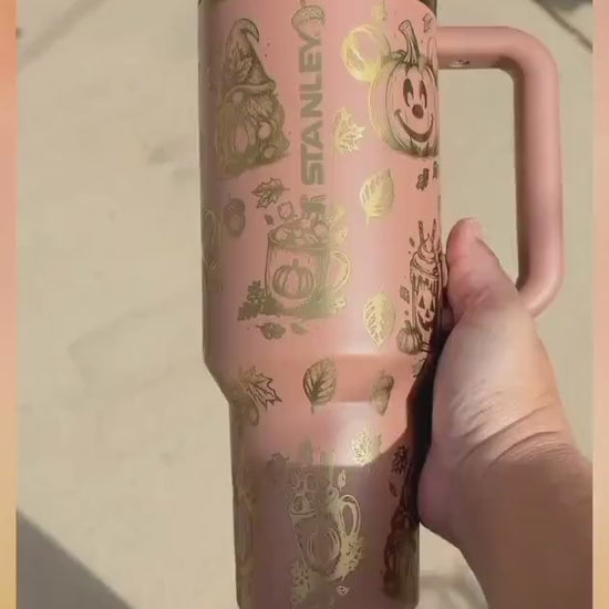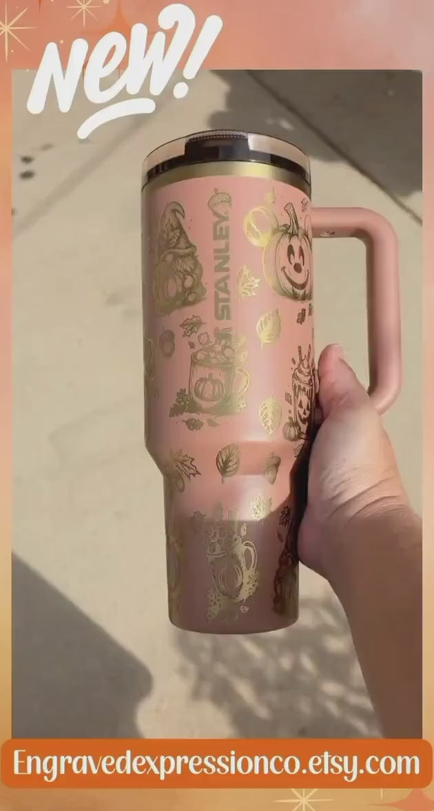 The Stanley Mocha Latte Tumbler is a premium autumn engraved tumbler designed for coffee lovers who want to enjoy their favorite seasonal drinks in style. Featuring a unique pumpkin coffee cup motif combined with an autumn gnome design, this engraved stainless steel tumbler offers both elegance and durability. Crafted with double wall insulation and vacuum insulated cup technology, it keeps beverages hot or cold for hours, making it the perfect thermal drink container for chilly fall mornings or refreshing iced teas. This stylish fall cup not only enhances your drink experience but also serves as an ideal fall lover gift or custom engraved tumbler option.
