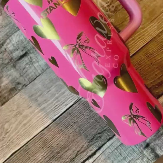 The Stanley pink tumbler is a limited edition engraved stainless steel travel mug designed to keep your hot and cold drinks at the perfect temperature while showcasing a unique bows and hearts design. This laser engraved tumbler offers full wrap engraving in gold, making it a stylish travel mug and a standout pink parade cup for daily use or special occasions. Crafted from durable stainless steel, this personalized drink container combines function with fashion to deliver a reliable and eye-catching experience. Whether you need a custom engraved gift for her or an engraved bridal gift, this tumbler is a perfect choice that blends practicality with elegance.