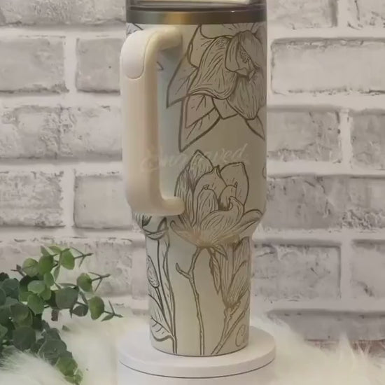 The Stanley Quencher Tumbler is a beautifully crafted engraved stainless steel travel cup designed to keep your beverages at the ideal temperature all day long. Featuring a full wrap engraving of a magnolia floral design, this custom floral tumbler combines style with function, making it the perfect nature lover gift. Made from high-quality stainless steel with double wall insulation, this vacuum insulated cup keeps drinks cold for up to 24 hours or hot for up to 12 hours. The cream moon Stanley color engraves in a stunning shade of gold, adding an elegant touch to your daily hydration routine.