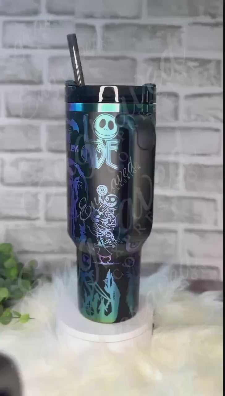The Stanley Quencher Tumbler is a premium engraved tumbler designed for keeping your drinks perfectly hot or cold while showcasing a unique Nightmare Before Christmas design. Crafted from durable stainless steel, this black chroma tumbler features double wall insulation and vacuum insulated cup technology that maintains your beverage temperature for hours. Whether you need a thermal drinkware solution for your morning coffee or a refreshing iced tea on the go, this personalized travel mug delivers both style and function for nature lover gifts or holiday themed tumbler collections.