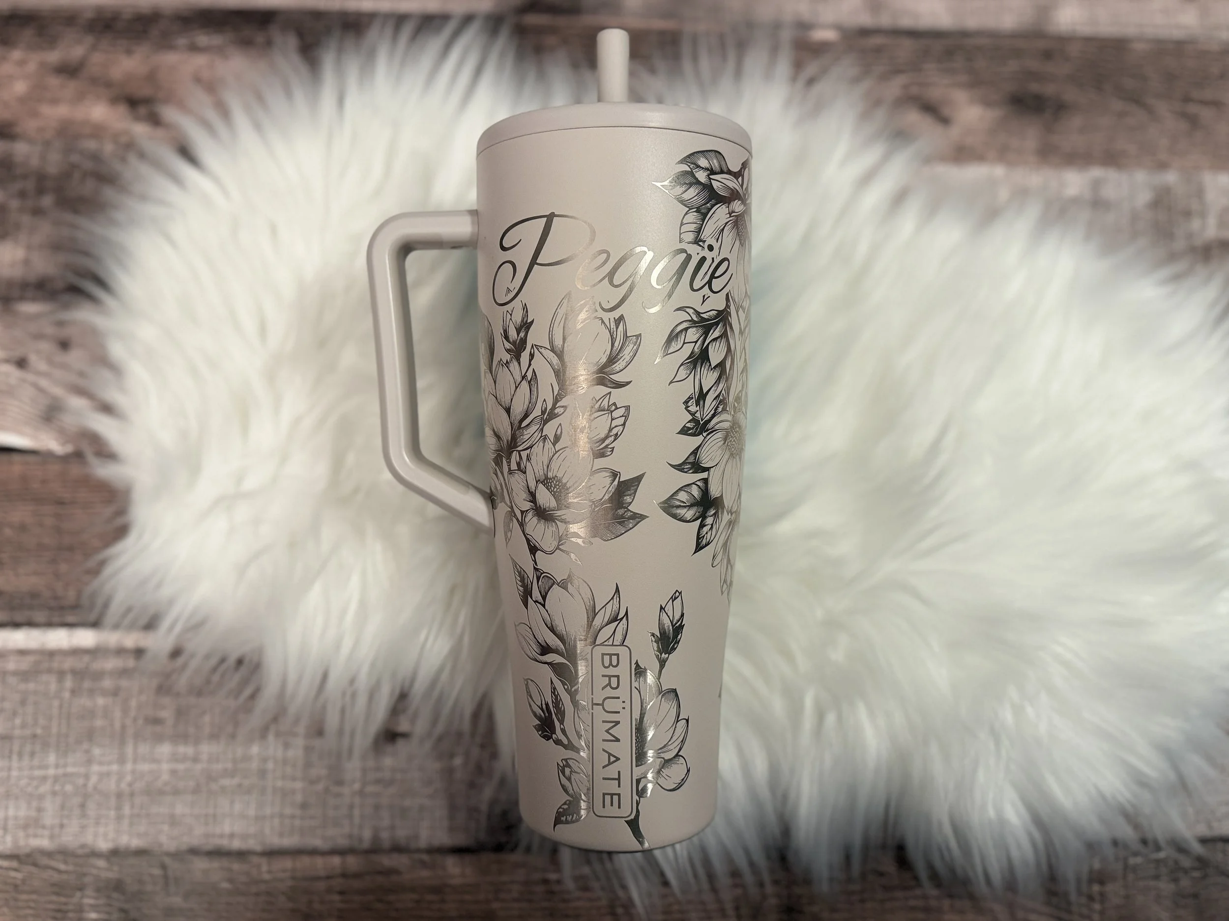 An Engraved Brumate Tumbler is also an amazing choice. They are available in 30oz and 40oz, and also in many colors. They are leak proof and have a silicone straw and stainless steel straw inside.